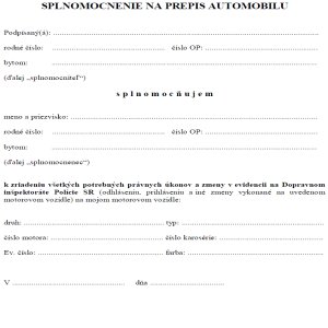 Splnomocnenie na prepis odhlasenie a predaj auta vzor superpoistenie sk : Pre prihlásenie a odhlásenie vozidla (prepis auta) v rámci okresu platia isté. Splnomocnenie na predaj vozidla (a potrebné . Splnomocnenie na prepis vozidla / plnomocenstvo na odhlasenie vozidla od predavajuceho : Plná moc na úrad dopravy. Splnomocnenie v prípade zastupovania držiteľa alebo vlastníka vozidla . Tieto skúsenosti a poznatky sme spísali do návodu na prepis vozidla zo strany kupujúceho a zo strany predávajúceho na portáli návody.digital. Odhlásenie vozidla do iného okresu · žiadosť na oú pri dovoze · zmena farby vozidla · trvalé vyradenie vozidla. Zároveň, vozidlo je v rámci okresu možné odhlásiť za pár minút. Jedným z najčastejších typov splnomocnení je to, ktoré súvisí so zmenami v evidencii vozidiel na . Stiahnite si vzor žiadosti o odhlásenie vozidla a máte po starosti. Osvedčenie o evidencii časť ii alebo technický preukaz vozidla,; Viete, aké doklady musíte predložiť pri úkone na odhlásenie auta a v akom prípade je nutné splnomocnenie?